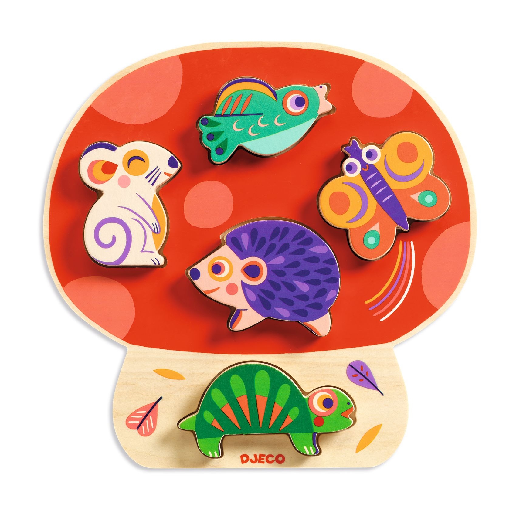 Ez egy könnyen összerakható fa puzzle a kerti állatkák témájában. A domború berakó állatfigurák lehetővé teszik, hogy a gyermek a képkirakáson kívül is játsszon az állatokkal. A teknős, egérke, sün kismadár és pillangó fa állatfigurák megállnak a talpukon. A gomba formájú alaplap még élénkebbé, még vonzóbbá teszi ezt a formaberakót.